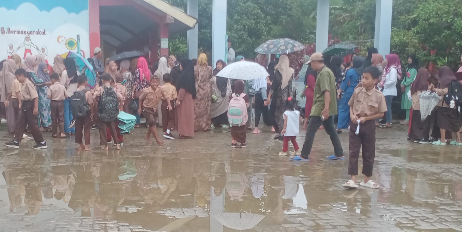 Meski kondisi cuaca kurang bersahabat, semangat murid dan wali murid tidak surut. Mereka tetap datang tepat waktu dan mengikuti rangkaian kegiatan pembagian rapor dengan penuh kesabaran dan antusias.