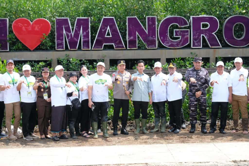 Tangerang, sorotbanten.com | Wakil Presiden Republik Indonesia Gibran Rakabuming Raka bersama Bupati Tangerang Moch. Maesyal Rasyid, Menteri Lingkungan Hidup Hanif Faisol Nurofiq, Wakil Menteri LH Diaz Hendropriyono, Gubernur Banten Andra Soni, serta Kapolda Banten Irjen Pol Hengki, melakukan kegiatan penanaman mangrove di Taman Mangrove Ketapang Urban Aquaculture (KUA), Kecamatan Mauk, Kabupaten Tangerang, pada Senin (27/10/2025).