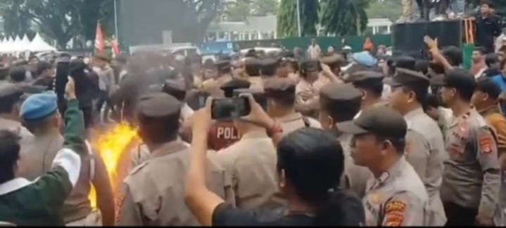 Situasi memanas ketika massa aksi membakar ban bekas sebagai simbol kekecewaan. Aparat kepolisian yang berupaya memadamkan api menghadang upaya tersebut hingga terjadi saling dorong antara mahasiswa dan aparat di lokasi.