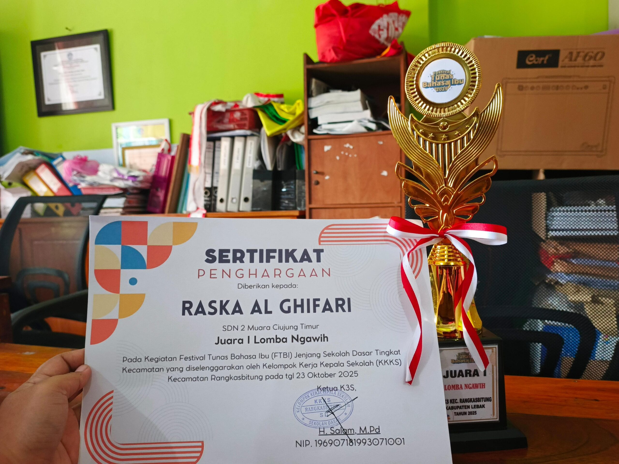 Lebak, sorotbanten.com | Kabar membanggakan datang dari SDN 2 Muara Ciujung Timur. Salah satu siswanya, Raska Al Ghifari, berhasil meraih juara pertama dalam lomba Ngawih (menyanyikan lagu daerah Sunda) pada ajang Festival Tunas Bahasa Ibu (FTBI) tingkat Kecamatan Rangkasbitung, Kabupaten Lebak, Banten, Tahun 2025.