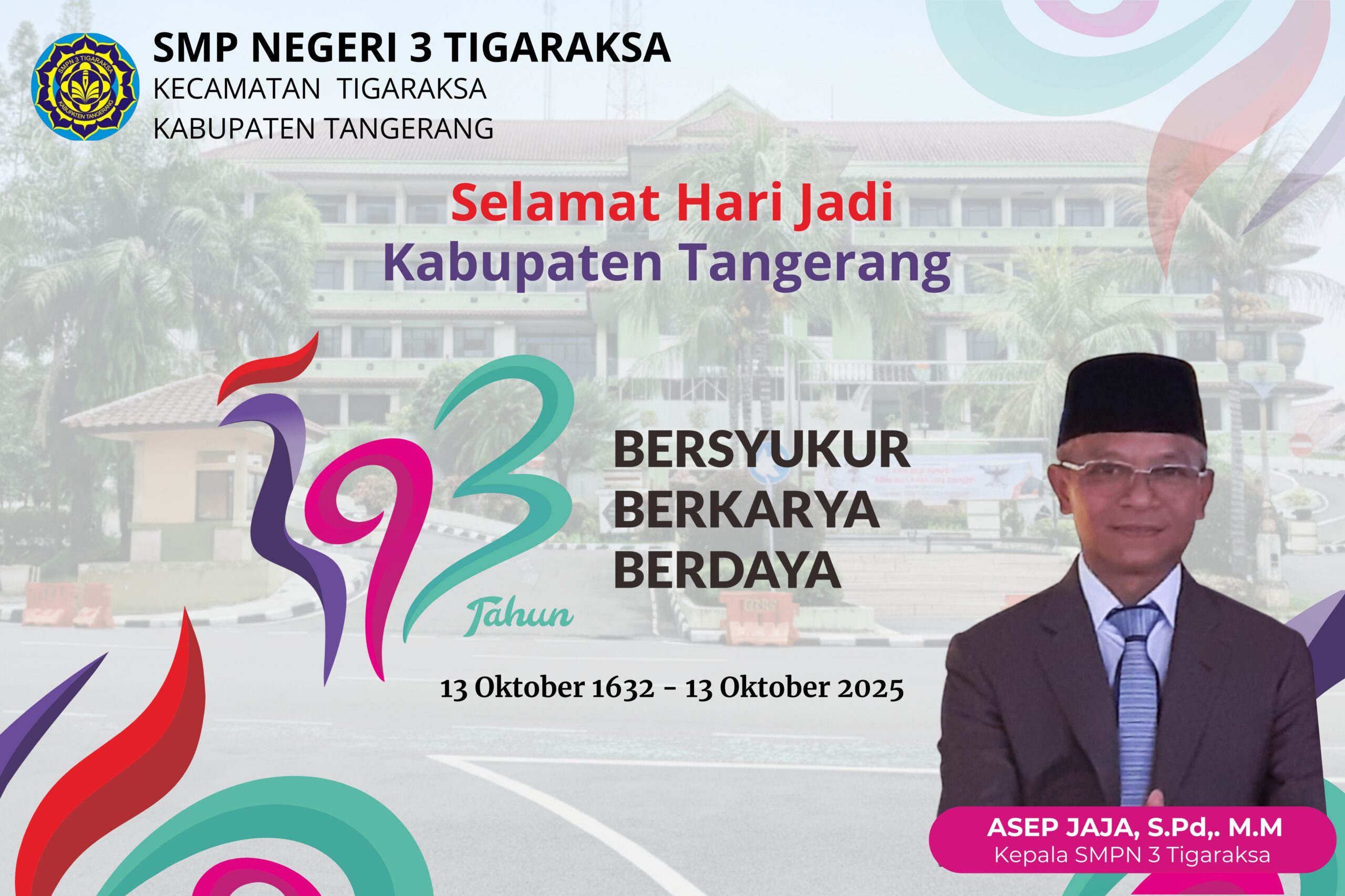 Tangerang, sorotbanten.com — Dalam semangat kebersamaan dan cinta daerah, Sekolah Menengah Pertama Negeri (SMPN) 3 Tigaraksa turut menyampaikan ucapan selamat Hari Jadi ke-393 Kabupaten Tangerang yang diperingati pada 13 Oktober 2025 mendatang. Dengan mengusung tema “Bersyukur, Berkarya, Berdaya,” keluarga besar SMPN 3 Tigaraksa menegaskan komitmennya untuk terus berkontribusi dalam membangun generasi muda yang unggul dan berkarakter.