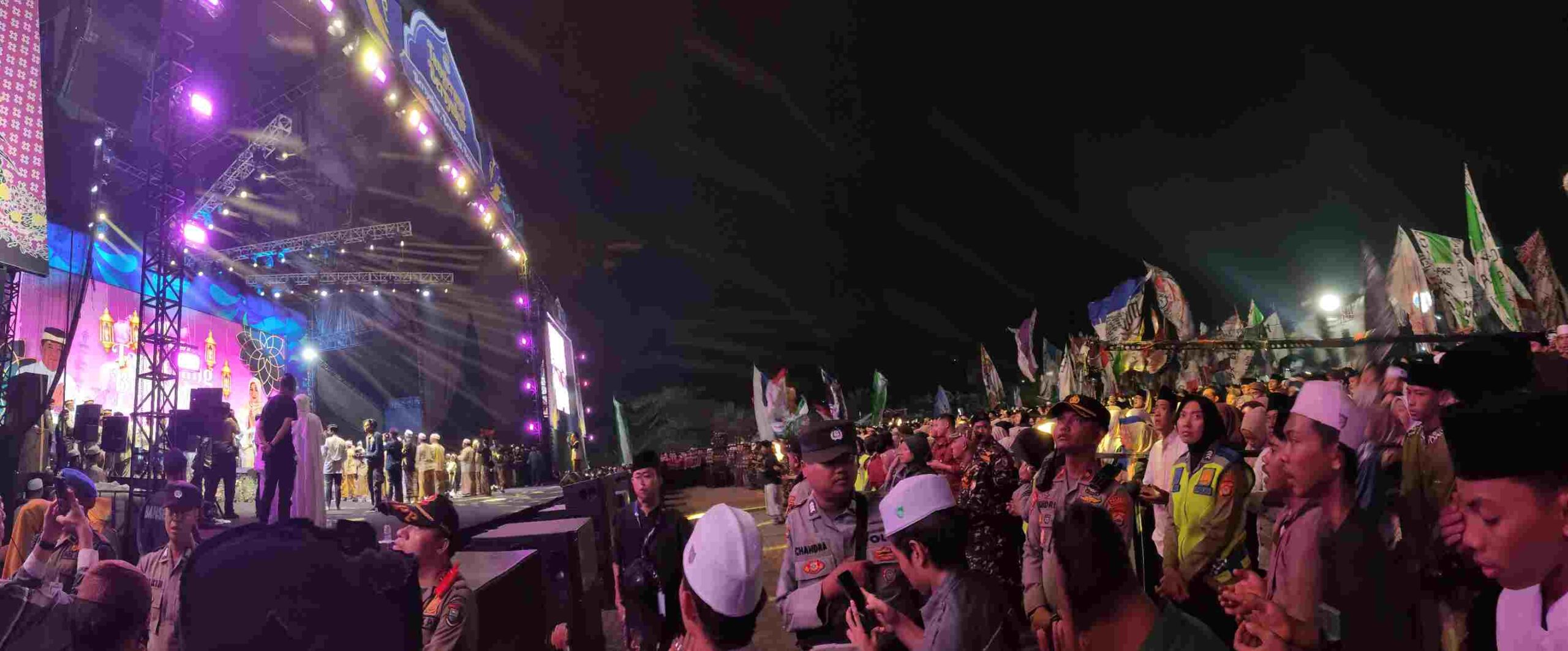 Suasana religius menyelimuti seluruh kawasan. Cahaya lampu panggung berpadu dengan lantunan shalawat dan doa bersama, menciptakan harmoni spiritual yang penuh makna.